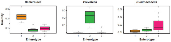 The clustering carried out in 2011 of fecal metagenomic samples from three different continents (Europe, North America, and Asia) were analyzed using three different sequencing technologies (Illumina, 454, and Sanger) and their profiling data were obtained from the 16S rRNA gene. This study led to propose the existence of three apparently well-defined and frequently recurring microbial communities (Figure 1). These clusters were identified as enterotypes [14]. Simply numbered from 1 to 3, these bacterial clusters were independent of the age, gender, cultural background, and geography of their respective hosts. Since then, the concept of enterotype has become part of the typical language of those involved in the analysis and diagnostics of the microbiota. An investigation into the properties of each of these clusters clearly highlights the structural type determined by the existence of covariant bacterial networks centered exactly on the indicator taxon (driver), a genus characterizing a given enterotype. In enterotype 1, with Bacteroides as the best indicator, covariant bacteria are, for example, Parabacteroides, Alistipes, and Bilophila. In enterotype 2, with Prevotella as the best indicator and whose abundance is inversely proportional to Bacteroides, covariant bacteria are, instead, Desulfovibrio and, sometimes, Succinivibrio. In enterotype 3, distinguished from the first two mainly by an over-representation of Firmicutes, the best indicators are Ruminococcaceae and Ruminococcus, and co-occurring taxa are frequently Akkermansia and Methanobrevibacter. In the complexity of each enterotype, negatively covariant bacteria are also highlighted. Taxa of this type are, for example, Methanobrevibacter for enterotype 1, Akkermansia for enterotype 2, and Prevotella for enterotype 3. Enterotypes 1 and 2, both dominated by taxa of the phylum Bacteroidetes, show abundances in the driver that are sharper than that shown by enterotype 3, in which the dominance of Ruminococcus appears less evident. Beyond the different dominance values observed in the three enterotypes, and despite the well-known functional heterogeneity of some genera in the execution of the clustering, the taxon-driver combination was chosen because it is at the taxon level that it was hypothesized, and it is still hypothesized, that the microbial ecological niches are reflected more clearly.