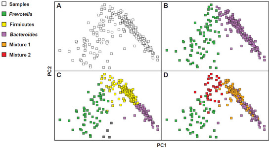 However, the clustering of the microbiota in models with two or three enterotypes is not the only possible model. In fact, in other subsequent studies, some authors opted for a clustering according to a model with four enterotypes, while others claimed the existence only of an evident compositional gradient, in the absence of visible clusters [19]. To understand how it was possible to arrive at such different considerations, one should observe the results obtained from the investigations of three large data sets, such as the Human Microbiome Project (HMP), the European Metagenomics of the Human Intestinal Tract project (MetaHIT), and the Chinese Metagenome Wide Association Study (MGWAS) [20,21,22]. As shown in Figure 2, whose configuration was obtained by calculating the distances between the samples, reporting the complex abundance distributions of some bacterial taxa, and highlighting the resulting clusters, the gradient is not very clean (Figure 2A) and, differently, at least two obvious masses, one on the right and one on the left, appear quite clearly. Then, resorting to the use of colors, some configurations seem to occur more frequently than others. Some of these coincide exactly with the Bacteroides, Prevotella and Firmicutes dominant clusters (Figure 2B,C). In the model with four enterotypes (Figure 2D), on the other hand, while the Bacteroides and Prevotella dominant clusters remain clear and separated, two mixed groupings are configured. The first, called Mixture 1, corresponds to a Firmicutes–Bacteroides superposition; the second, called Mixture 2, corresponds instead to an overlap, quantitatively less important than the first, Firmicutes–Prevotella. This preference for specific profiles of microbial communities is however modest and a higher density of samples around the preferred constellations also counteracts a certain proportion of samples that fall between them. This makes it difficult to mathematically describe these preferred microbial compositions or to accurately determine the number of such densely populated areas. However, it is important to characterize these pseudo-groupings of bacterial communities to then try to understand their properties and intrinsic ecological constraints. Note, however, precisely in relation to the properties of these clusters, that in the three-cluster model here described there is only a partial correspondence with the classical clustering in which enterotype 3 has a dominance of Ruminococcus and Ruminococcaceae. In the three-cluster model used to justify also the four-cluster model, more than a dominance of Ruminococcus and Ruminococcaceae, an enlarged dominance of the phylum Firmicutes is observed. This phylum is variously split together with the other two clusters, giving rise to the four-cluster model. Understanding the different models used is important. In this case, for example, it justifies how, in the original model [14], the enterotype 3 (Ruminococcus) is the least frequent in the population, while, in the modelling used to explain the possible “multiple” interpretations of the bacterial landscape [19], the Firmicutes cluster is both the most frequent and the most decisive one in the visualization of the four-cluster model.