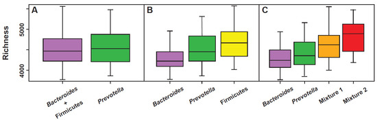 Relationship between functional richness and gut microbiota clusters evaluated according to the models that consider the existence of 2 (A), 3 (B), or 4 (C) clusters. Modified from [19].
