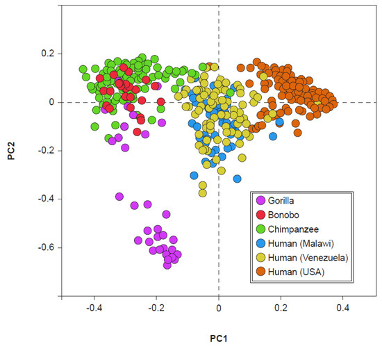 Visualization, through principal coordinates (PC1 and PC2), of gut bacterial consortia of some primates (including humans). Modified from: [47].