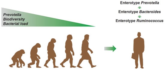 Therefore, from an evolutionary perspective (see Figure 5), it is plausible to hypothesize that the microbiota perhaps starts from a Prevotella dominant condition, with high biodiversity and bacterial load, and, from there, it progressively evolves, losing these characteristics. In fact, during the evolutionary process, man begins to eat the meat of carcasses and develops a very low gastric pH, a phenomenon that makes the first contribution to the reduction in the biodiversity of bacteria. The cooking of food, which is responsible for a large part of the telencephalic development, then determines the shortening of the colon to the benefit of the small intestine. This transition determines the strong reduction in the total bacterial load. In small steps, this evolution also proceeds in modern times, in which, due to an increasingly evident reduction in dietary fibers, a transition from enterotype 2 to enterotype 1 is observed [52]. The antibiotic era, capable of selecting bacterial patterns with slower proliferation, then perhaps gave way to a new transition from enterotype 1 to enterotype 3. The latter, numerically less evident, still retains the “scar” of Bacteroides often co-dominant with Ruminococcus and Ruminococcaceae. On the contrary, the absence of Prevotella, rarely co-dominant in enterotype 3, indicates the possible correctness of this view. Enterotype 3, however, shows a recovery of richness to levels more frequently observed in enterotype 2 (Prevotella), typical, instead, of the man who lives in rural areas and eats a diet rich in dietary fibers. This aspect could be linked, as previously mentioned, to a selection process perhaps connected to the environment increasingly saturated with antibiotics, but also, more likely, to an increasingly prevalent condition of constipation, probably due to an increasingly stressful lifestyle and to an increasingly clear lack of fibers in the diet.
