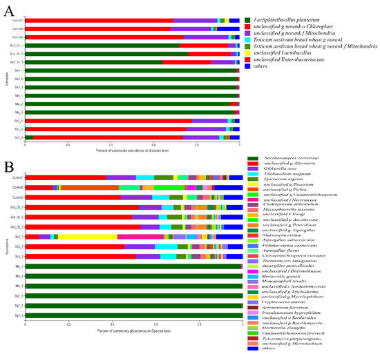 High-throughput sequencing was used to analyse the distribution of bacteria and fungi at the species level. The microbial diversity identification results, as shown in Figure 2, revealed L. plantarum and S. cerevisiae as the most dominant organisms, which proved that the sourdough samples used in this experiment were not contaminated. In the bar chart of the bacterial community distribution (Figure 2A), L. plantarum was the absolute dominant bacterial species in the sourdough samples fermented by Sx3 culture alone and mixed culture at 0 h and 6 h of fermentation.