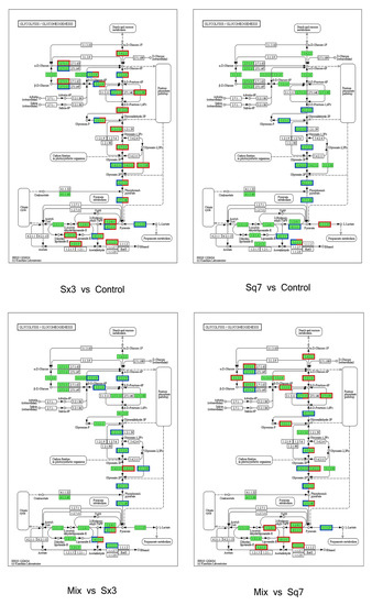 In this study, KEGG functional enrichment analysis was performed on the proteins involved in carbohydrate metabolism, and the biological processes related to the proteins were determined at the functional level (Figure 4). In the process of carbohydrate metabolism, the following metabolic pathways were involved in four different fermentation types of sourdoughs: starch and sucrose metabolism, glycolysis, TCA cycle, pentose phosphate pathway, pyruvate metabolism, and amino sugar and nucleotide sugar metabolism. The fluctuation of protein content is based on the control sourdough. More proteins in sourdough fermented by Sx3 were significantly downregulated (86, p < 0.05) in each pathway of carbohydrate metabolism than were upregulated significantly (19, p < 0.05). In sourdough fermented by Sq7, the situation was opposite. There were more proteins (for instance, protein belonging to glycolysis, fructose and mannose metabolism) that were found significantly upregulated (16, p < 0.05) than downregulated (9). These results indicated that Sx3 plays a more important role in the fermentation of sourdough.