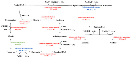 TCA-cycle of Mix vs Sq7, the enzymes coloured in blue represent upregulated, in red represent downregulated enzymes, in green represent the enzyme is no significant difference.