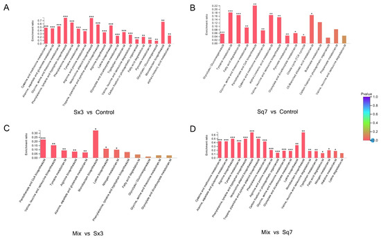 KEGG enrichment diagram of amino acid metabolism. The abscissa represents pathway name, and the ordinate represents enrichment rate (refers to the ratio of the protein number enriched in this pathway to the background number of the protein annotated into this pathway; the higher the ratio, the greater the degree of enrichment). The color gradient of the column represents the significance of enrichment. The deeper the default color is, the more significant the enrichment of the KEGG term is. “***” represents p < 0.001, “**” represents p < 0.01, and “*” represents p < 0.05.