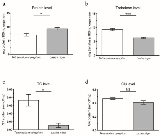 The content of protein (a), trehalose (b), TG (triglyceride) (c), and glucose (d) in Tetramorium caespitum and Lasius niger. Asterisks indicate statistically significant differences (* p < 0.05; *** p < 0.001); NS, not significant. Each measurement contains six to eight replicates.