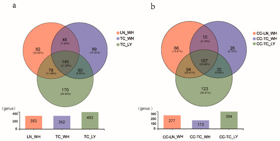 Venn diagram demonstrating the quantities of common and unique microorganism species at genus level between (a) ant groups and (b) spider groups. TC_LY, T. caespitum Luoyang; TC_WH, T. caespitum Wuhan; LN_WH, L. niger Wuhan; CC-, spiders fed different diets. Each measurement contains six replicates.