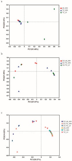 Principal coordinate analysis (PCoA) plots of the bacterial community for ants (a) and spiders (b) and together (c) based on Bray−Curtis distance matrix (PERMANOVA p < 0.05). Each symbol represents one sample. TC_LY, T. caespitum Luoyang; TC_WH, T. caespitum Wuhan; LN_WH, L. niger Wuhan; CC−, spiders fed different diets.