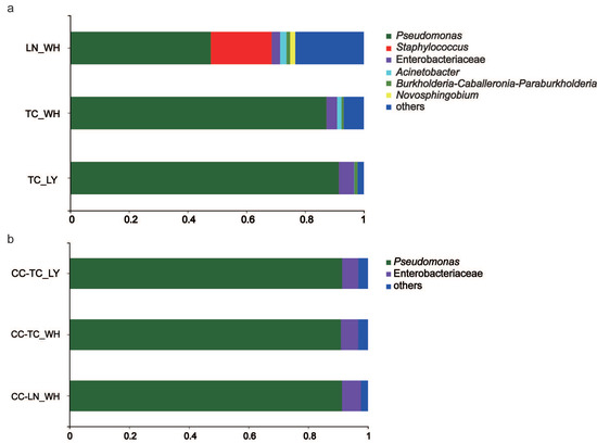 PCoA of the weighted UniFrac distance resulted in a 2-dimensional solution of ants in which PC1 accounted for 61.49% of the variation and PC2 for 25.34% (Figure 3a, PERMANOVAR, p = 0.002). PCoA based on the spiders revealed that the first two principal component scores accounted for 67.87% and 21.88% of the variation, respectively (Figure 3b, PERMANOVAR, p = 0.776) and together with the last one (Figure 3c) These graphs demonstrate that all three spider groups were clustered together, indicating that their communities have a similar composition. The ant groups differed significantly (Table S3). Bar graphs exhibiting the differences in the six dominant species of microbiota further validate the findings of PCoA (Figure 4). While there was significant variation among ants (Figure 4a), the dominant microbiota species in spiders were of the same genus (Figure 4b). The genus with the highest relative abundance was Pseudomonas.