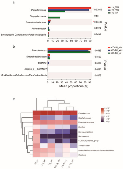 Comparison of the top five most abundant genera in ants (a) and spiders (b). *, p ≤ 0.05. Heatmap (c) shows the relative abundances of the ten most abundant genera in the six sample groups. Dendrograms for hierarchical cluster analysis grouping genera and sample locations are shown at the left and top, respectively. The color scale represents the normalized values of relative abundances by log10. Zero values were added as 1 and log10 transformed. TC_LY, T. caespitum Luoyang; TC_WH, T. caespitum Wuhan; LN_WH, L. niger Wuhan; CC-, spiders fed different diets.