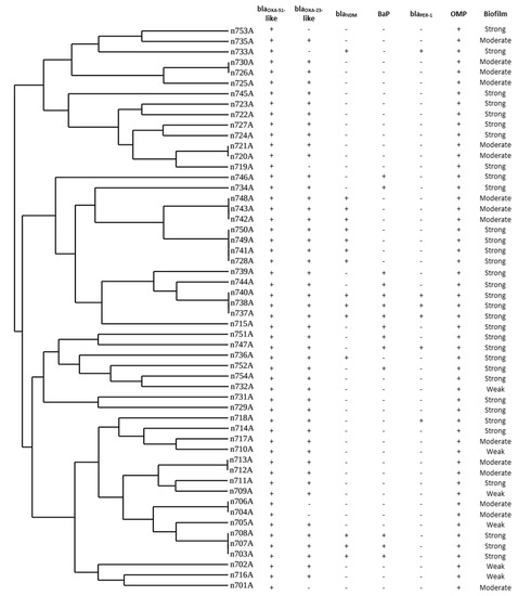 - Yang, C.H.; Su, P.W.; Moi, S.H.; Chuang, L.Y. Biofilm Formation in Acinetobacter Baumannii: Genotype-Phenotype Correlation. Molecules 2019, 24, 1849. [Google Scholar] [CrossRef]