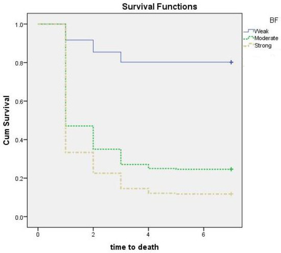 Pairwise comparison for the survival of G. mellonella larvae infected with clinical carbapenem-resistant Acinetobacter baumannii (CRAB); BF, biofilm. Isolates divided into three groups according to its biofilm-producing ability (poor (N = 6), moderate (N = 15), and strong (N = 33)). The larvae were injected with 105 colony-forming units (CFU) into their last right proleg. Each isolate was tested against a group of 20 larvae, which were kept for 7 days at 37 °C, and examined for death every 24 h. The experiments were performed three times, and the average reading was considered.
