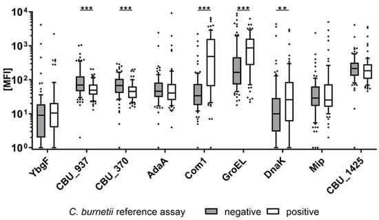 Antibody levels in the reference panel of 76 C. burnetii seropositive and 91 seronegative reference samples. CBU_937, CBU_370, Com1, and GroEL show a significantly different distribution (p < 0.05) between the two reference groups. Stars above boxplots indicate the level of significance, p < 0.01 (**); p < 0.01 (***).