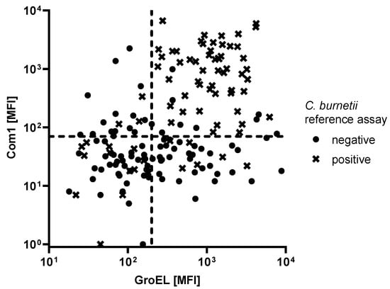 Antibody responses against the C. burnetii antigens Com1 and GroEL measured in 76 C. burnetii seropositive and 91 seronegative patients. Dashed lines (x = 200 MFI; y = 70 MFI) indicate the respective cutoffs to obtain a specificity of 90% and a combined sensitivity of 71%.