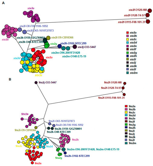 The following are available online at https://www.mdpi.com/article/10.3390/microorganisms9112374/s1, Figure S1. Five main clusters of Stx2a-Stx2g and representative sequences of six newly designated Stx2h-Stx2m subtypes: Neighbour-Joining cluster analysis of 102 unique sequences as described in the text and the proposed new designations.