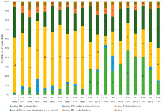 We compared different cultivation approaches for each participant (Figure 1). For the saliva samples, enrichment and direct plating showed comparable numbers of unique OTUs. By contrast, for the fecal samples, enrichment yielded the highest number of unique OTUs, which were not detected by any other cultivation approach. As with the saliva samples, the overlap in OTUs between the enrichment broth and directly inoculated solid media was substantial (4–32 OTUs), and the diversity of populations on plates inoculated after enrichment was poor. The number of unique OTUs after direct plating was high (6–27) in saliva samples and lower (1–11) in fecal samples.