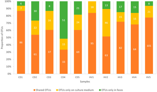 Furthermore, we also sequenced the original uncultured fecal sample. Next, we merged all the OTUs detected by any of the three different cultivation approaches and compared them with the original fecal sample (Figure 2). A substantial number of OTUs were detected in feces (45–92 in CD patients; 72–109 in HVs; Supplementary Table S2), and 33–101 OTUs were shared with cultivation-enriched fractions. Many OTUs (7–46) were only detected in fractions cultivated on gluten and not in the original uncultivated samples (Figure 2). The most represented genus that was only detected in cultivated samples was Lactobacillus, followed by Enterococcus, Pseudomonas, and two unidentified representatives from Enterobacteriaceae and Bifidobacteriaceae (Supplementary Table S2). The average percentage of OTUs not detected in feces but detected in gluten-containing medium did not differ between CD patients and HVs: 17.8% vs. 19.8%, respectively. Interestingly, the proportion of OTUs not detected by any of the cultivation approaches varied considerably among all ten individuals (0–51%).