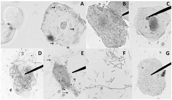 - Martínez-Figueroa, C.; Cortés-Sarabia, K.; Del Carmen Alarcón-Romero, L.; Catalán-Nájera, H.G.; Martínez-Alarcón, M.; Vences-Velázquez, A. Observation of intracellular bacterial communities in urinary sediment using brightfield microscopy; A case report. BMC Urol. 2020. [Google Scholar] [CrossRef]