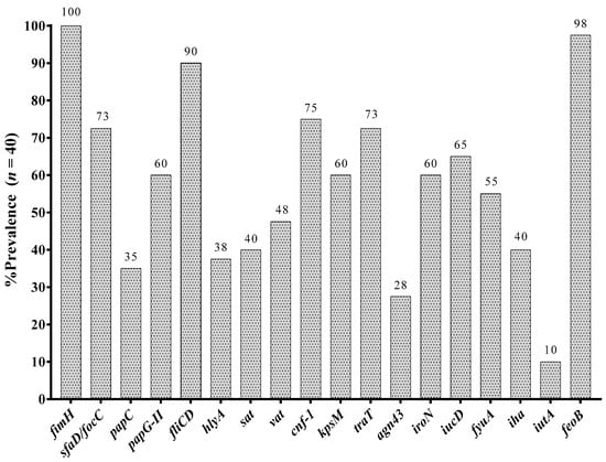 Prevalence of 18 virulence genes in analyzed clinical isolates of UPEC. fimH: Fimbrial Adhesin of type 1 pilus; sfaD/focC: S fimbriae minor subunit/F1C fimbriae chaperone; papC: Type P pilus chaperone; papG-II: Type P pilus Adhesin allele 2; fliCD: Flagellin subunit/flagellar cap; hlyA: α-hemolysin; sat: Autotransporter secreted toxin; vat: Vacuolating autotransporter toxin; cnf-1: Necrotizing cytotoxic factor; kpsM: Capsular variant; traT: Serum resistance protein; agn43: 43 antigen; iroN: Salmochelin siderophore receptor; iucD: Aerobactin; fyuA: Yersiniabactin; iha: Bifunctional enterobactin receptor/adhesin protein; iutA: Ferric aerobactin receptor; feoB: Ferrous iron transport protein B.