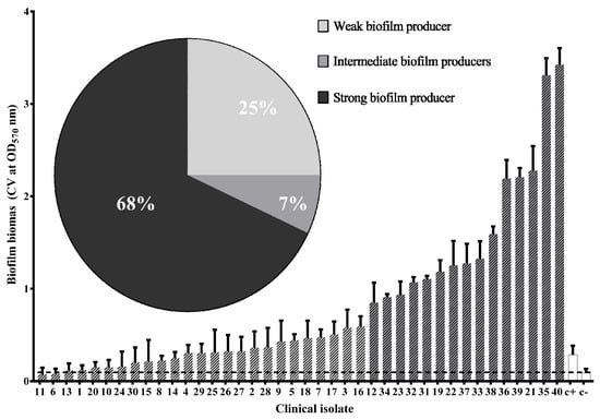All clinical isolates were biofilm producers (100%), but only 68% were strong biofilm producers (Figure 3). Comparing the prevalence of virulence genes in each biofilm producer group, a significant difference was observed only in the higher prevalence of iucD (p = 0.03) and papC (p = 0.05) genes in the strong biofilm producers.