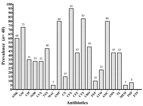 Antibiotic resistance prevalence. AMK: Amikacin; GM: Gentamicin; CIP: Ciprofloxacin; NOR: Norfloxacin; LVX: Levofloxacin; TSX: Cotrimoxazole; MAC: Nitrofurantoin; AMP: Ampicillin; CX: Cefoxitin; CFX: Cefuroxime; CFZ: Ceftazidime; CTX: Cefotaxime; CRO: Ceftriaxone; FEP: Cefepime; ATM: Aztreonam; AMC: Amoxicillin/Clavulanate; AMS: Ampicillin/Sulbactam; TE: Tetracyclin; MEM: Meropenem; IMP: Imipenem; ETP: Ertapenem.