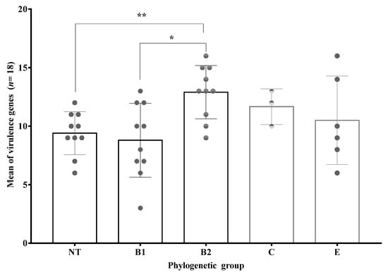 According to the mean of virulence genes in each phylogenetic group, more virulent UPEC isolates belong to B2 phylogenetic group. However, statistical significance was observed only in the higher mean of virulence of B2 vs. B1 and NT phylogenetic groups (Figure 6). We also observed that the prevalence of specific virulence genes was different between phylogenetic groups. In this sense, papC, iroN, and fyuA, which are genes related to highly pathogenic E. coli, were most prevalent in isolates from B2 phylogenetic group (Table 5).