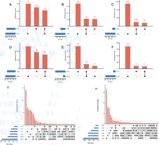 UpSet graphs reporting the unique and shared OTUs within each accession in the two years 2017 and 2018. Each graph reports the result of a different accession: (A) accession H; (B) accession A; (C) accession G; (D) accession N; (E) accession W; (F) accession C. Graphs reporting the comparison of shared and unique OTUs identified between different accessions in (G) year 2017 and (H) year 2018.