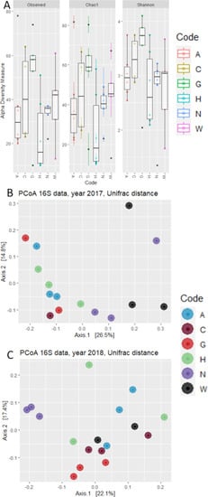 Analysis of Alpha diversity highlighted very close values for the number of observed OTUs and Chao-1 index (Figure 2A), suggesting that despite the low number of total reads assigned to bacteria, the depth of sequencing might be adequate. There were no statistically significant differences between sampling years or accessions on the values of Observed OTUs (p-value = 0.166), Chao-1 index (p-value = 0.182), or Shannon’s index (p-value = 0.547), according to a One-Way ANOVA test.