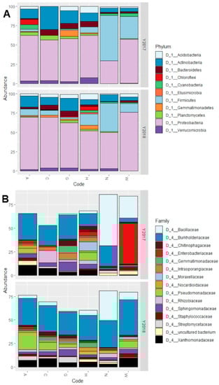 Graphs reporting the microbiota composition as relative abundance (%) at (A) phylum level and (B) family level. Both graphs show the accession on the X-axis and the percentage of relative abundance on the Y-axis. The Y-axis is also divided in two grids, one for year 2017 and one for year 2018. Bars reaching a total below 100% in (B) are due to OTUs assigned to families other than the most abundant 15 not being plotted on the graph.