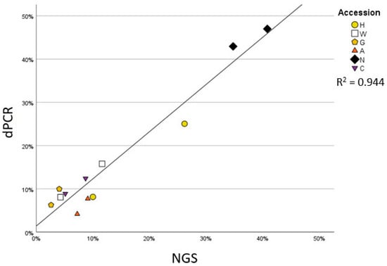 Considering the relatively low number of obtained reads, a complementary approach was employed to ascertain the quantitative nature of our results. As the abundance of Firmicutes emerged as a distinctive feature of the maize embryo microbiota across accessions, we employed a quantitative digital PCR to assess the abundance of members of this phylum as a proportion of 16S rRNA gene copy number. This investigation revealed a correlation of R2 = 0.944 (Figure 4, p-value = 0.000) between the two quantification approaches, suggesting that, despite the limited number of amplicon sequencing reads, the Firmicutes-led microbiota diversification represents a genuine trait of the communities inhabiting maize embryos.