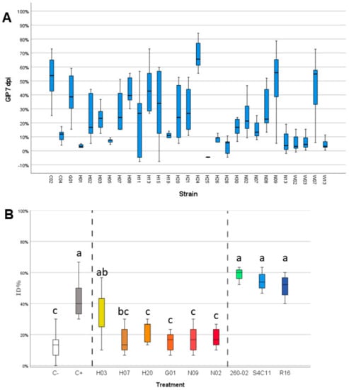 Severity of FV-induced symptoms obtained during in vivo biocontrol assays (2.3.2) and in field susceptibility assays (2.4) were compared between treatments by one-way ANOVA followed by Tukey’s post-hoc test (p < 0.05) carried out in SPSS statistics v27 (IBM, Armonk, NY, USA).