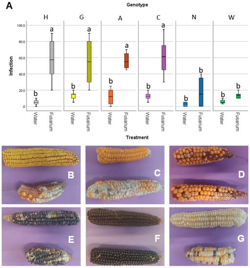 The susceptibility to the disease associated with F. verticillioides, fusarium ear rot, was assayed in field, using both non-inoculated maize ears (natural infection) and performing an experimental inoculum of the silk channels with a suspension of conidia from F. verticillioides strains. The severity of the disease was assessed visually, as percentage of the ear that was infected with Fusarium (Figure 6). All the maize accessions gave similar infection rates under natural infection: while accession N and W had lower infection than the other 4, even though this difference was not statistically significant (Figure 6A). Conversely, in the F. verticillioides inoculated ears, statistically significant differences were reported: accessions N and W had infection values similar to the naturally infected ears, while the remaining four accessions had way higher infection values. This can also be seen by the pictures of representative ears of maize of the different accessions (Figure 6B–G). This suggests that these two accessions may have an adaptive advantage under conditions conducive to the establishment of Fusarium infections.