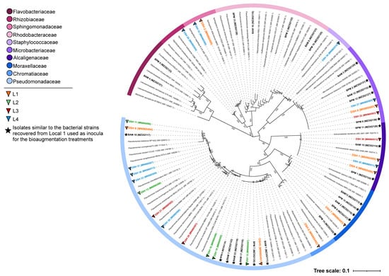 Evolutionary relationships of the isolated strains can be observed in the 16S rRNA gene phylogenetic tree indicated in Figure 3. Different bioremediation treatments and culture media used for the isolation of hydrocarbon degrading microorganisms seem to have selected several strains belonging to ten different families, with the largest fraction of the strains belonging to the genus Pseudomonas. The phylogenetic analysis of the isolates attributed to the families Rhodobacteraceae and Flavobacteriaceae showed that the BPM3 and BPM4 strains formed a separate branch in the phylogenetic tree (Figure 3). The BPM3 and BPM4 strains belong to the Aquicoccus and Frondibacter genera, respectively, and present a similarity percentage of 96.97% and 95.71% with their closest neighbors of the GenBank (Aquicoccus porphyridii strain L1 8–17 for BPM3 and Frondibacter mangrovi strain 02OK1/10-76 for BPM 4) database. With these results, these strains can constitute a new taxon considering that the similarity limit for a new species is 98.7% [42].