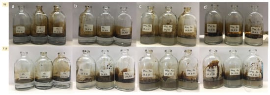 Visual inspection of oil degradation in the beginning (T0) and end (T15) of the bioremediation experiments in controlled laboratory conditions. The four treatments are natural attenuation (a), biostimulation (b), bioaugmentation with inoculum pre-grown in petroleum (c) and bioaugmentation with inoculum pre-grown in acetate (d).