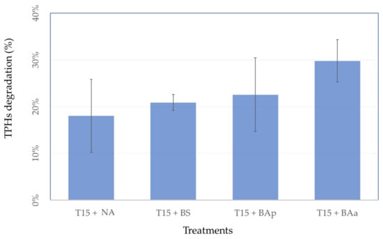 Total Petroleum Hydrocarbon degradation observed at the end of the 15-day experiment (mean and standard deviation, n = 3). T15 + NA: natural attenuation; T15 + BS: biostimulation; T15 + BAp: bioaugmentation with inoculum pre-grown in petroleum; T15 + BAa: bioaugmentation with inoculum pre-grown in acetate.