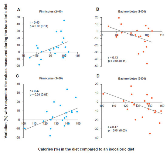 Firmicutes and Bacteroidetes trends as the calories in the diet vary with respect to an isocaloric condition for the individual regardless of their phenotype (obese or lean). Firmicutes variation with 2400 kcal/day (A) and 3400 kcal/day (C) diets. Bacteroidetes variation with diet at 2400 kcal/day (B) and at 3400 kcal/day (D) [30].