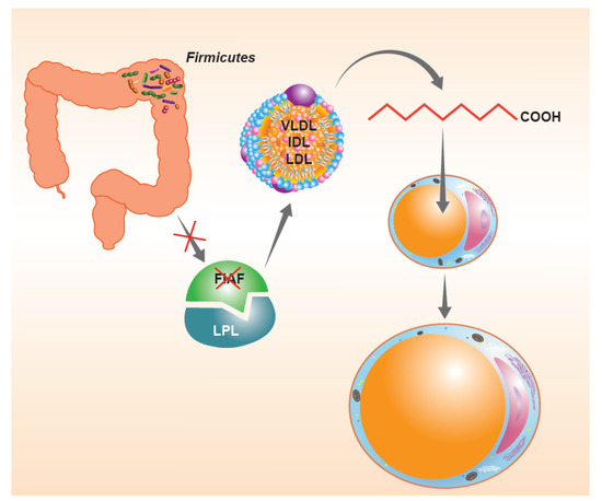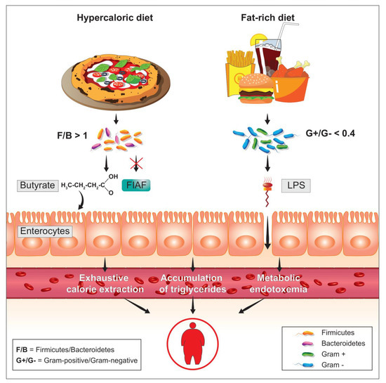 In consideration of what has been described so far, the intestinal microbiota, when particularly rich or unbalanced in favor of the phylum Firmicutes, seems to be an important “microbial” factor capable of influencing the energy balance of the host. For a long time, there have been questions about the possible mechanisms responsible for this phenomenon. As anticipated before, the tolerance of a lower pH would facilitate the Firmicutes in the continuous fermentation of the residual fiber to short-chain fatty acids. However, there are also other possible “whys”, perhaps a little more biochemical. The first would seem to involve the suppression of intestinal expression of a lipoprotein with inhibitory functions on intestinal lipase (LPL), known as the fasting-induced adipose factor (FIAF). The suppression of the FIAF induced by intestinal bacteria (Figure 2), mainly when belonging to the phylum Firmicutes, would in fact increase the activity of LPL, producing an increase in the capacity of extraction of fatty acids from post-prandial fat particles, primarily chylomicrons, with an increase in the performance of fat accumulation within the adipocytes [32]. A second mechanism, capable of determining changes in the energy balance of the host, would appear to be connected precisely with the ability to extract residual energy from the fecal material described above. Much of the high molecular weight fiber ingested with the meal in fact escapes the host’s glycosidases, but can be effectively metabolized by colonic bacterial populations, with relative production of short-chain fatty acids, mainly acetate, propionate, and butyrate [33]. The colonic epithelium derives 60–70% of the energy necessary to survive from the simple presence of short-chain fatty acids produced by the microbiota, mainly butyrate [34,35]. The presence of important relative Firmicutes values can lead to an increase in catabolic capacity with an increase in the production of local butyrate values such that they are able to “feed” the entire enterocyte population. The phenomenon obviously could lead to a lack of use of 30–40% of calories that the enterocyte should instead derive from the systemic circulation. These calories are obviously not “wasted” but stored in the form of body fat. Conversely, when Bacteroidetes are relatively dominant, the most produced fiber is propionate. This short-chain fatty acid is not absorbed by the enterocyte but passes through it and ends up entering the cycle of hepatic gluconeogenesis, probably fueling the phenomenon of satiety and, in the long run, insulin resistance [36,37]. Then, there is a third aspect that deserves consideration. In fact, it is possible to investigate the metabolic preferences, a reflection of the gene contribution alone, of the various phyla [38]. From this point of view, they are in fact quite different from each other. For example, Enterobacteriaceae are preferentially proteolytic and lipolytic. Actinobacteria are mostly saccharolytic. Firmicutes, on the other hand, tend to be “generalists”, that is, efficient in proteolytic, saccharolytic and lipolytic demolition practically in equal measure. It is therefore easy to understand how this can be disadvantageous in a modern, western and rich society, where food abundance is the rule. Whatever the host gives them to eat, the Firmicutes “eat”.