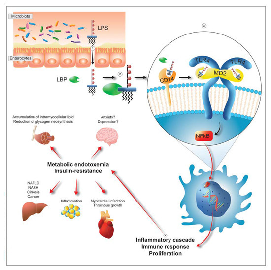 After passing the barrier formed by enterocytes (step 1), LPS interacts with the LPS-binding protein, known as LBP (step 2). The complex then interacts with the CD14 placed on the membrane of the target cells (step 3). Then, CD14 transfers LPS into the receptor pocket of the complex constituted by TLR4 (Toll-like receptor 4) and MD2 (myeloid differentiation-2) triggering a cascade of intracytoplasmic events which culminates with the entry of NFkB (nuclear factor kappa-light-chain-enhancer of activated B cells) into the nucleus and subsequent transcription and translation into proteins (mainly cytokines) with specific inflammatory characteristics (step 4). The presence of these cytokines, feeds phenomena such as metabolic endotoxemia and tissue insulin-resistance (step 5). Both, by acting on the different organs, have different consequences. In the liver, they promote the development of NAFLD (non-alcoholic fatty liver disease), NASH (non-alcoholic steatohepatitis), cirrhosis and cancer. In the striatal-skeletal musculature they promote accumulation of intramyocellular lipid and reduction of glycogen neo-synthesis. In the adipose tissue they promote inflammation. At cardiac and cardio-vascular levels they predispose individuals to an increased risk of myocardial infarction and thrombus growth. Finally, in the brain, they probably promote pathologies such as anxiety and depression.