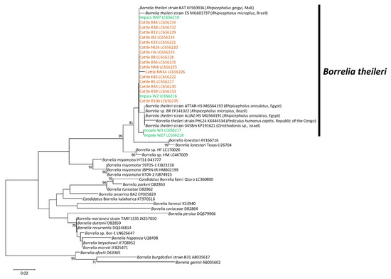Phylogenetic trees were constructed to obtain information on the genetic association of our detected Borrelia spp. with other Borrelia species in the database. Based on the phylogenetic inference of the flaB gene, our detected Borrelia spp. from impalas and cattle were located within the clade of Borrelia theileri (Figure 1).