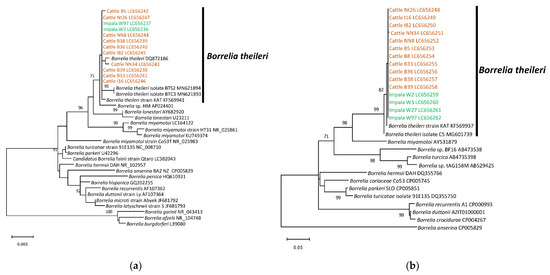 Similarly, the detected Borrelia spp. from impalas and cattle were positioned within the clade of Borrelia theileri in the phylogenetic trees based on the almost full-length 16S rDNA and the partial sequence of hpt (Figure 2).