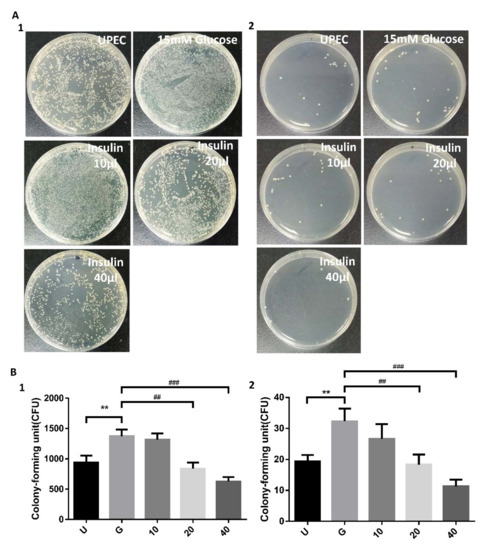 Influence of insulin on UPEC infection in bladder cells in a high glucose environment. SV-HUC-1 cells were pretreated with different concentrations of insulin and 15 mM glucose for 24 h and then infected with pGFP-UPEC (MOI:1:100) as described in the text. UPEC infection in bladder cells was examined by plating on NB medium agar (A) and determined using Image J software (B). Colony forming units (CFUs) were acquired after plating out lysed solutions of infected cells. The counting results of the lysate diluted 100 and 10,000 times were shown in (A1), (B1) and (A2), (B2), respectively. Data are expressed as the mean ± SD of three independent experiments. The definitions of each letter/number represented by the X axis are: U: UPEC infection alone; G: with 15 mM glucose pretreatment; 10, 20 and 40: pretreated with 10, 20 and 40 μg/mL insulin, respectively + 15 mM glucose. ** p < 0.01, compared with the infection control group. ## p < 0.01, ### p < 0.001, compared with the 15 mM glucose pretreated group.