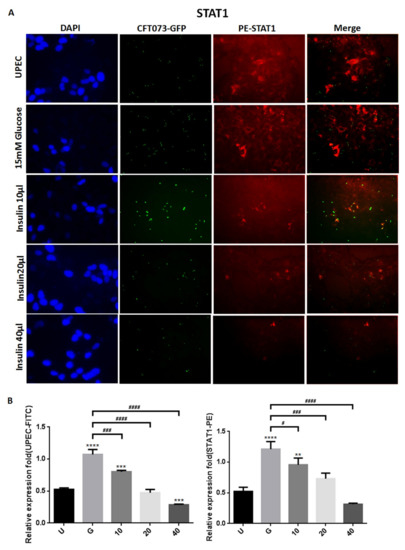 Insulin affected UPEC infection and STAT1 expression in bladder cells. After 24 h of pretreatment with different concentrations of insulin and 15 mM glucose, GFP-UPEC and PE-STAT1 expression in SV-HUC-1 cells post-infection were (A) observed by fluorescence microscopy and (B) measured using ImageJ software. Cells infected with UPEC alone were used as the positive controls. The data shown are representative of a typical result. DAPI was used to count the number of cells and as a standard for calculating the fluorescence expression ratio of cells. Cell images were captured using a microscope (Leica) at 100× magnification. Data are expressed as mean ± SD from three separate experiments. The definitions of each letter/number represented by the X axis are: U: UPEC infection alone; G: with 15 mM glucose pretreatment; 10, 20 and 40: pretreated with 10, 20 and 40 μg/mL insulin, respectively + 15 mM glucose. ** p < 0.01, *** p < 0.001, **** p < 0.0001, compared to positive control groups. # p < 0.05, ### p < 0.001, #### p < 0.0001, compared between the two groups.