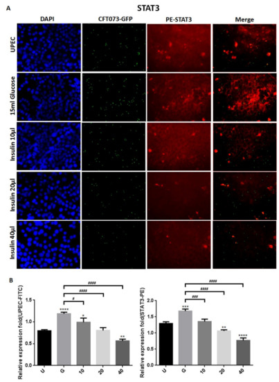 Insulin affected UPEC infection and STAT3 expression in bladder cells. After 24 h of pretreatment with different concentrations of insulin and 15 mM glucose, GFP-UPEC and PE-STAT3 expression in SV-HUC-1 cells post-infection were (A) observed by fluorescence microscopy and (B) measured using ImageJ software. Cells infected with UPEC alone were used as the positive controls. The data shown are representative of a typical result. DAPI was used to count the number of cells and as a standard for calculating the fluorescence expression ratio of cells. Cell images were captured using a microscope (Leica) at 100× magnification. Data are expressed as mean ± SD from three separate experiments. The definitions of each letter/number represented by the X axis are: U: UPEC infection alone; G: with 15 mM glucose pretreatment; 10, 20 and 40: pretreated with 10, 20 and 40 μg/mL insulin, respectively + 15 mM glucose. * p < 0.05; ** p < 0.01, *** p < 0.001, **** p < 0.0001, compared to positive control groups. # p < 0.05, ### p < 0.001, #### p < 0.0001, compared between the two groups.