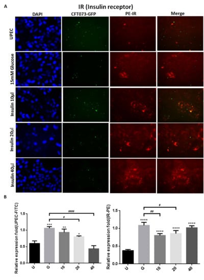 Insulin affected UPEC infection and insulin receptor expression in bladder cells. After 24 h of pretreatment with different concentrations of insulin and 15 mM glucose, GFP-UPEC and PE- insulin receptor (IR) expression in SV-HUC-1 cells post-infection were (A) observed by fluorescence microscopy and (B) measured using ImageJ software. Cells infected with UPEC alone were used as the positive controls. The data shown are representative of a typical result. DAPI was used to count the number of cells and as a standard for calculating the fluorescence expression ratio of cells. Cell images were captured using a microscope (Leica) at 100× magnification. Data are expressed as mean ± SD from three separate experiments. The definitions of each letter/number represented by the X axis are: U: UPEC infection alone; G: with 15 mM glucose pretreatment; 10, 20 and 40: pretreated with 10, 20 and 40 μg/mL insulin, respectively + 15 mM glucose. * p < 0.05; ** p < 0.01, *** p < 0.001, **** p < 0.0001, compared to positive control groups. # p < 0.05, ## p < 0.01, #### p < 0.0001, compared between the two groups.