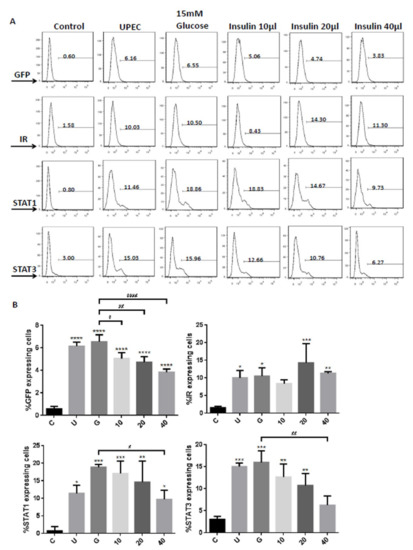 The data obtained from the flow cytometric test showed similar results of both STAT1 and STAT3 expression in fluorescence microscopy, in which pretreatment with insulin dose-dependently decreased UPEC infection and expression of STAT1 and STAT3 in the bladder cells, especially in the 40 μg/mL-treated group (p < 0.05 and 0.01, respectively, as compared to the 15 mM glucose-treated group) (Figure 5A,B). In the flow cytometry experiment, insulin was also found to induce IR expression more obviously, but not significantly different from the glucose treatment group (Figure 5A,B). These results confirm that insulin not only reduces UPEC infection but also downregulates the expression of STAT1 and STAT3 in bladder cells, unlike IR expression.