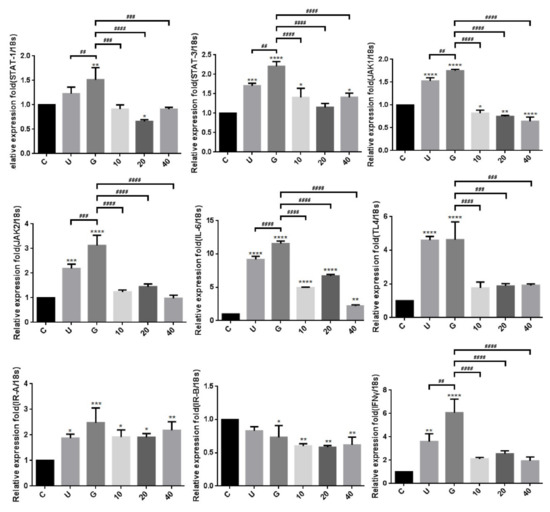 Transcriptional effects of insulin on JAK/STAT1 signaling pathway in UPEC-infected bladder cells in a high-glucose environment. Total RNA was isolated from treated cells and analyzed using qPCR. The mRNA levels of JAK1, JAK2, STAT1, STAT3, IFN-γ, IL-6, TLR-4, and IR-α/β were detected in UPEC-infected bladder cells with different concentrations of insulin and 15 mM glucose pretreatment for 24 h. The definitions of each letter/number represented by the X axis are: C: control; U: UPEC infection alone; G: with 15 mM glucose pretreatment; 10, 20 and 40: pretreated with 10, 20 and 40 μg/mL insulin, respectively + 15 mM glucose. Data from three separate experiments are expressed as mean ± SD. * p < 0.05; ** p < 0.01; *** p < 0.001, **** p < 0.0001, compared to positive control groups. ## p < 0.01, ### p < 0.001, #### p < 0.0001, compared between the two groups.