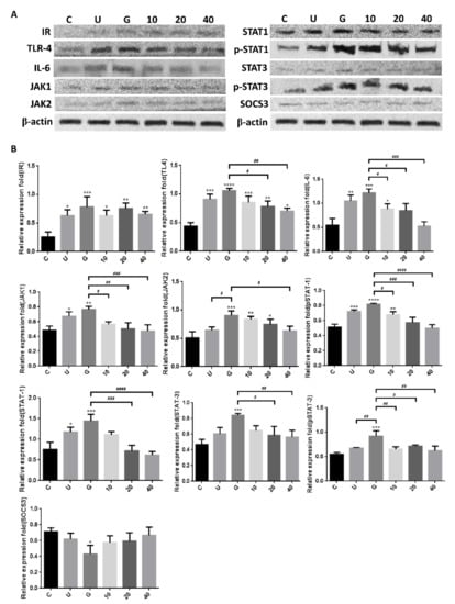 The proteins in the sample were harvested using RIPA lysis buffer (Merck Millipore, Burlington, MA, USA). The experimental procedure was also following our previous publication [24]. The antibodies used are listed as follows: anti-JAK1 (BD biosciences, East Rutherford, NJ, USA); anti-JAK2, anti-STAT1 (Cell Signaling, Beverly, MA, USA); anti-pSTAT1, anti-STAT3 (Cell Signaling, Beverly, MA, USA); anti-pSTAT3, anti-SOCS3 (Abcam, Cambridge, UK); anti-insulin receptor (Abcam, Cambridge, UK); anti-TLR-4 (Proteintech, Chicago, IL, USA); anti-IL-6 (Bioworld Technology, St Louis Park, MN, USA); and anti-β-actin (Santa Cruz, Santa Cruz, CA, USA) at room temperature (RT) for 1 h. After the incubation with the appropriate secondary horseradish peroxidase-conjugated IgG antibody (R&D Systems) for 30 min at RT, the protein bands on the membrane were detected with ECL-Plus Western Blot Detection system (GE Healthcare UK LTD) according to the instructions of the manufacturer. All experiments were replicated at least thrice.