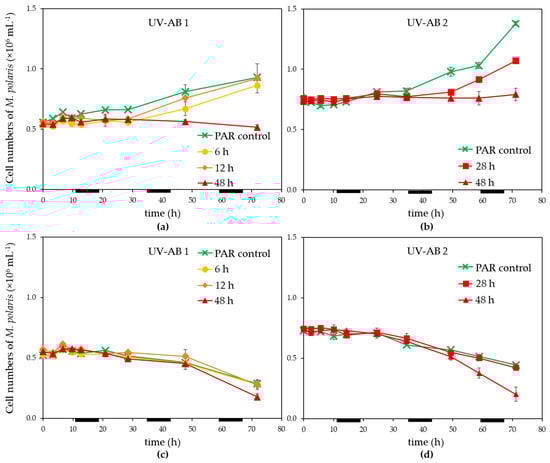 Temporal dynamics of (a,b) non-infected controls, (c,d) infected Micromonas polaris abundance under PAR + UV-AB exposure (6, 12, 28 and 48 h, over 72 h experimental duration) compared with PAR-only controls for (a,c) experiment 1 and (b,d) for experiment 2. Average values with standard deviation (n = 2, except for experiment 2 PAR-only control where n = 1). Light–dark cycle was 16:8 h, during dark periods UV exposure was stopped. The horizontal black bars indicate the dark period.