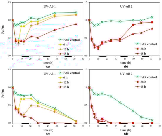 Photosynthetic efficiency (Fv/Fm., normalised to starting value) for (a,b) non-infected controls, (c,d) infected M. polaris under UV-AB exposure during (a,c) experiment 1 and (b,d) experiment 2. Average values with standard deviation (n = 2 except for experiment 2 PAR-only control where n = 1). The horizontal black bars indicate the dark period.