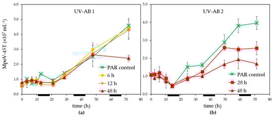Temporal abundance of virus MpoV-45T under UV-AB exposure during (a) experiment 1 and (b) experiment 2. Average values with standard deviation (n = 2 except for experiment 2 PAR-only control where n = 1). The horizontal black bars indicate the dark period.
